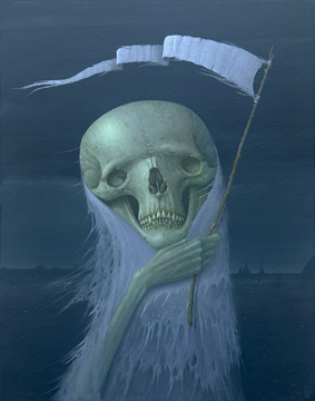 BIO - Matthew Kirscht is a self taught artist currently living in Richmond Virginia. He has shown work in New Orleans, Philadelphia, New York, California and Missoula. Apart from his own line of Halloween themed artwork that began in 1996, he has illustrated dozens of Wacky Packages stickers for Topps, and explores themes of anxiety, paranoia, self sabotage, and neglect in paintings featuring storybook style anthropomorphic animals and food.